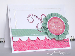 There are so many things I love about Dana’s gorgeous birthday card. The lines she created on the scalloped white layer with her gel pen add some great texture. Combine that with the pretty ruffled ribbon and the rhinestone flourish and she’s got one knockout of a birthday card! And pairing it with the cute numbered designer paper just completes the birthday picture! Congratulations Dana, on being my choice for Perfect Princess this week!