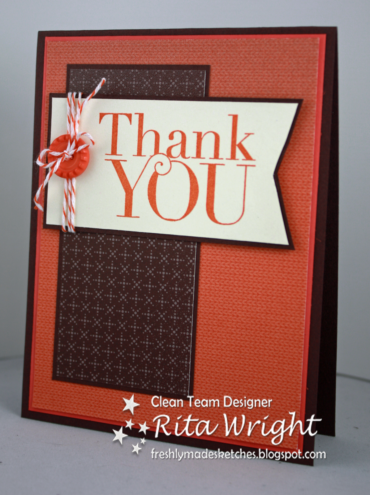 Freshly Made Sketches is starting on our next 100 challenges with a bang! We had some fabulous entries this week! Picking a winner from over 100 beautiful creations is not easy. I chose Kathryn's card because of her creative interpretation of the sketch. The bright colors against the white backdrop are so cheerful! And then there's that twine! It makes a beautiful rainbow of color - such a fun card! Thanks everyone for joining us this week.........now I am off to chillax! Congratulations, Kathryn, on being the Queen of Clean!