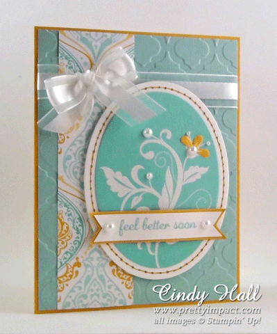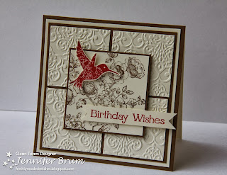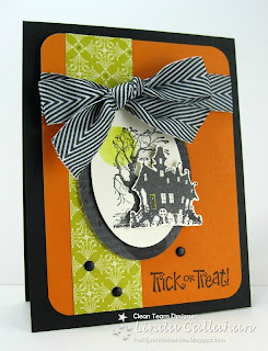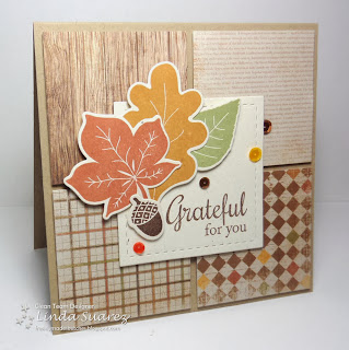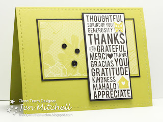 This is a gorgeous fall card with a non-traditional fall color scheme, and I just kept going back to it to see more. Annette's details are awesome... the added "splatter" on the leaves, the white dots around the circle, the touch of white on the woodgrain embossing and the wonderful way she added the sentiment, just to name a few! Congrats, Annette! You're the Queen of Clean this week!