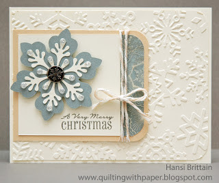 I just loved this beautiful snowflake card! I love clean white backgrounds and this one just totally jumped out at me. This card totally reminds me of the holidays and feels so rustic to me. The blue and white snowflake with matching embossed background is fabulous! Congrats, Hansi! You're the Queen of Clean this week!