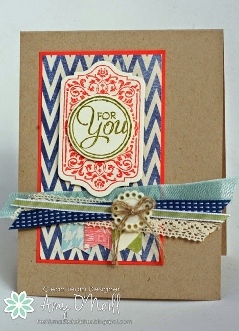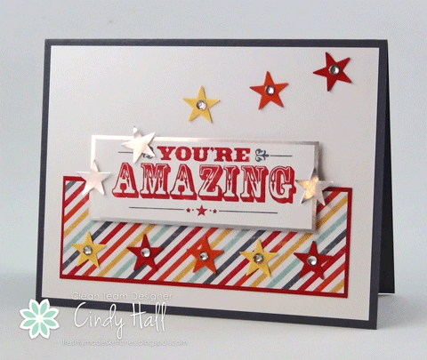 Thanks to everyone who played along with our sketch this week. With all the fabulous entries you sure make it hard to pick a fave! In the end I chose the patriotic colors and CAS design of Laurie's card. The colorful layered stars paired with the subtle chevron striped patterned paper made a perfect backdrop to that chalkboard style layer. To me it looks like someone scrawled the sentiment on the chalkboard when the teacher wasn't looking! Congratulations Laurie on being the Queen of Clean this week!