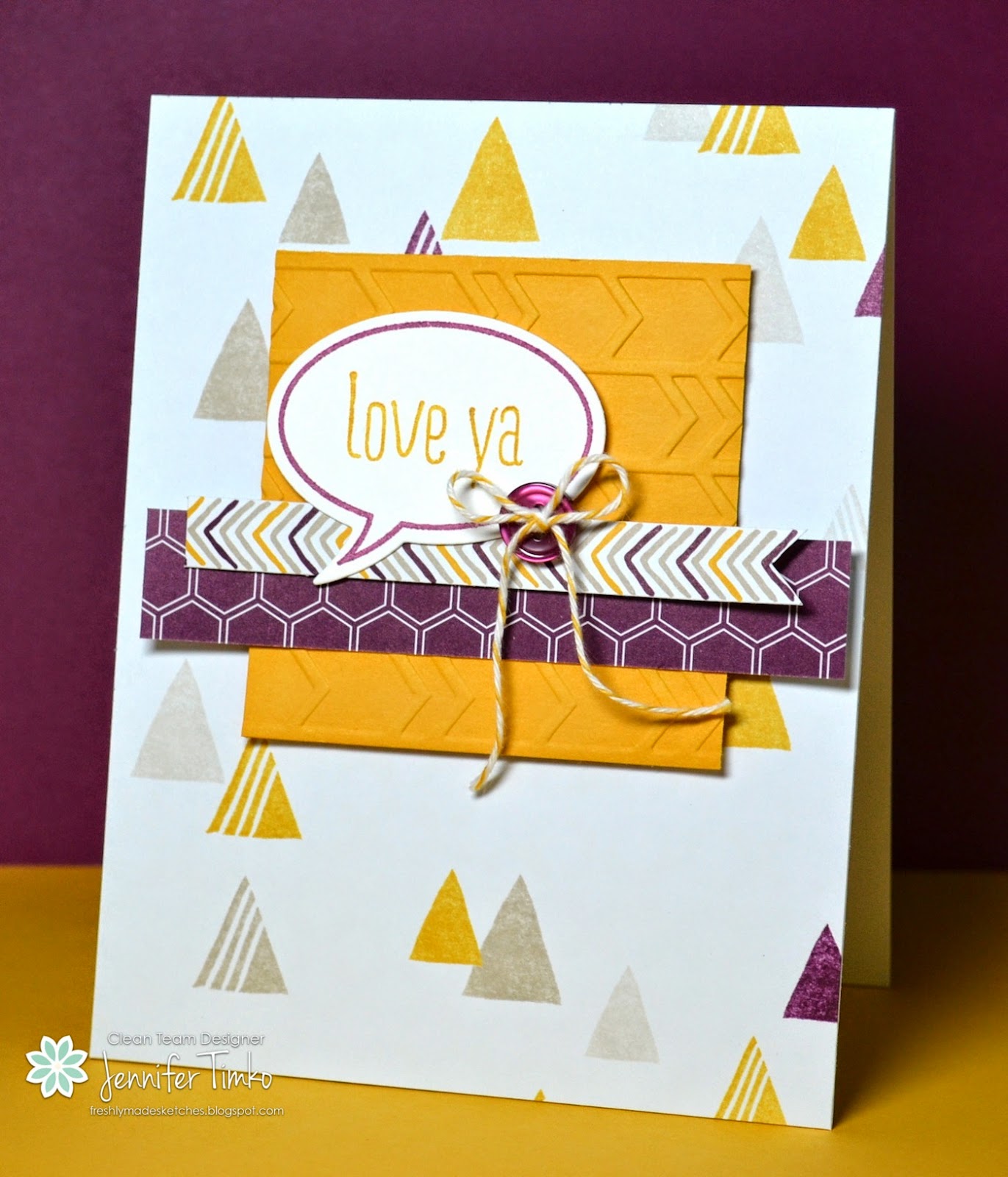 Welcome to my favorite stamping day of the week! Jen Timko here with this week's sketch. Well, I'm not sure how you all do it but the gallery truly gets better and better each week. This week's sketch is pretty simple but hopefully leaves you lots of room to play. Focus on DSP, fun stamps or even e-cutter panels….whatever inspires you. The design team has a fab variety for your inspiration. I can't wait to see what you create!