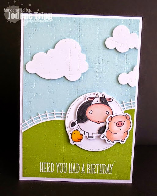 Wow! Thank you all so much for playing along with my sketch this week! There were so many beautiful cards in the gallery! It was so hard to choose just one! Jodene's card jumped out at me as soon as I saw it! I just loved those little barnyard animals (I have a secret love for pigs!) and the texture in the grass, sky and clouds! Her colouring is fabulous! Congrats, Jodene you're my pick for Queen of Clean!